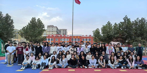 在短暂的实习过程中,我见证了孩子们对知识的渴望和对未来的向往,我不仅关注他们学业方面的问题,更注重学生德智体美劳的全面发展。我给班级学生组织了球类竞技、拔河比赛、诗朗诵等课外活动,让他们在比赛中感受团结的重要性,进而向他们传授“各民族要向石榴籽那样紧紧抱在一起”的理念。【附:与班级学生的合照】