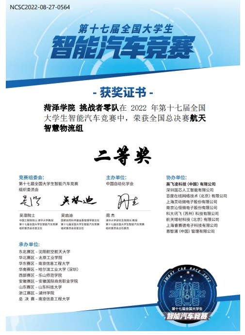 经过激烈角逐,由我校beat365平台官方网站李申奥、王宝元和侯恒辰三位同学组成的参赛队——“挑战者零队”,在王秀霞、贾忠上和张冠芬三位老师的精心指导下,参赛学生不畏酷暑,克服各种技术难题,秉持着敢闯、敢拼的信念,从全国遴选的77支队伍中脱颖而出,勇夺全国总决赛航天智慧物流组二等奖。