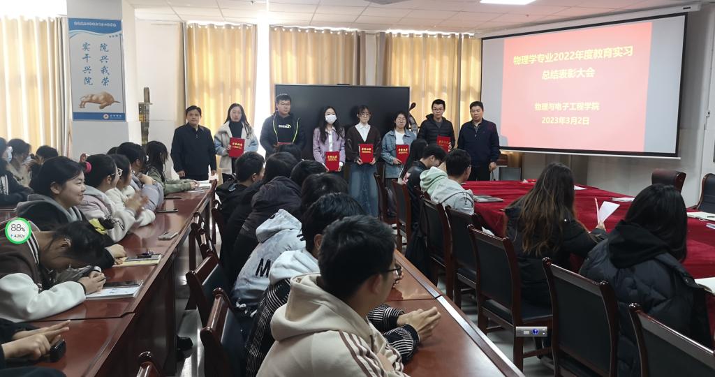 优秀实习生代表张文婧和靳方寒同学结合自身实习经历为2021级物理学专业的同学进行了经验分享。通过这次教育实习,学生普遍认为收获很大,通过规范化的教学训练,初步培养了他们从事中学物理教学的能力。在实习学校任教的过程中,逐步学会了如何将所学的专业知识、教育学、心理学知识综合运用于中学教学实践,这为今后走上工作岗位,更快、更好地适应中学教学奠定了良好的基础。