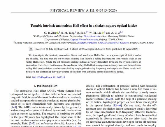 近日,我校beat365平台官方网站朱国宝博士以第一作者身份在国际权威物理学期刊《Physical Review A》(中科院二区期刊和Nature index收录期刊)上发表了题为《Tunable intrinsic anomalous Hall effect in a shaken square optical lattice》的研究论文。