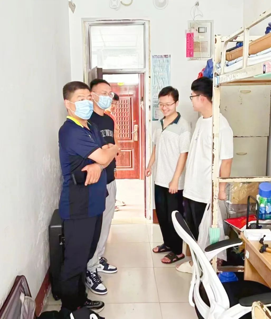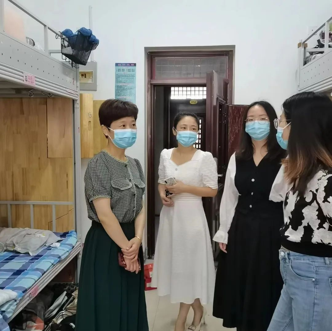 为贯彻落实学校疫情防控工作要求,深入了解学生返校后的生活情况和需求,排查宿舍安全隐患,2022年8月27日上午,beat365平台官方网站党委书记徐鹤同志、党委副书记祝清森同志以及辅导员老师吴京育、贾晓蒙、董双双、李晨等深入宿舍走访慰问返校学生。