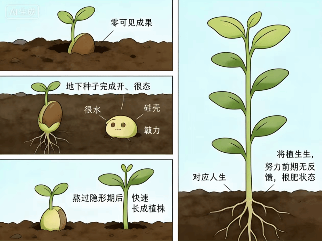 1.种子埋入土壤初期,无发芽、长高的显性变化,处于“零可见成果”状态。