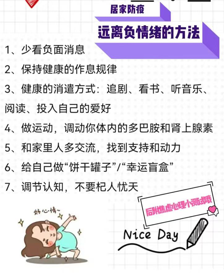 对疫情之下产生的不良情绪,不必过分压抑,学会坦然接受、适当表达、合理宣泄。有研究结果表明,阅读放松效果最佳,6分钟内就能够降低压力水平68%,听音乐能够降低61%的压力,喝茶或咖啡降低54%,散步降低42%。记得每天为自己安排一次阅读、听音乐等放松活动和半小时以上的体育锻炼时间,有效缓解不良情绪。必要时要积极寻求心理热线、咨询等专业帮助。