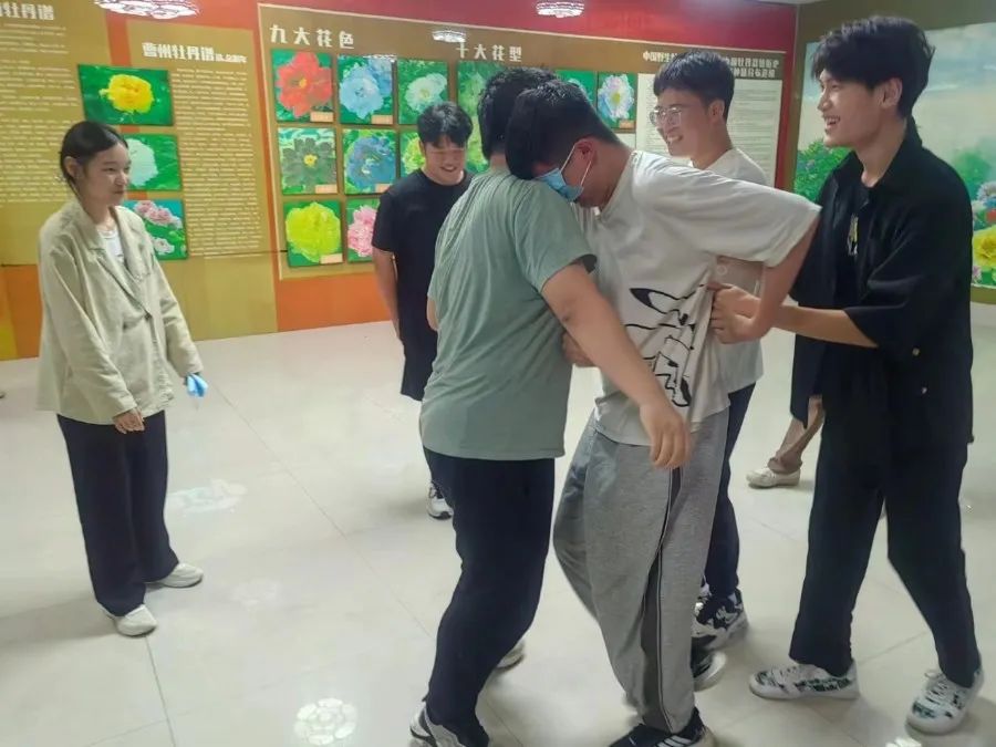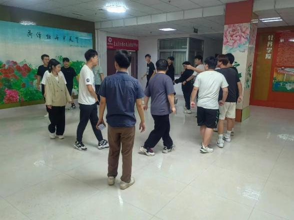 此次活动分为虎克船长、盲人和哑人两个环节。同学们了解活动规则后开始自由分组,平均分成三支队伍进行第一项比赛。比赛开始,同学们快速地掌握了游戏技巧,进入游戏状态,现场氛围逐渐火热,同学们沉浸在欢声笑语中。第二个环节中同学们变为两支队伍,分别进行盲人和哑人的扮演,游戏进行得热火朝天。活动接近尾声,同学们表示身心感到了放松,压力也得到了缓解。