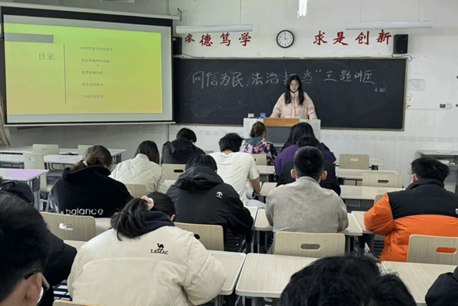 活动期间,负责人围绕网络诈骗、恶意软件入侵、信息泄露等现实案例展开详细讲解,让同学们真切直观地感受到网络安全的重要性。她深入剖析常见网络诈骗类型,从AI换脸借钱骗局、诱导点击的未知链接,到暗藏危机的网络交友诈骗,将每一种诈骗手段详细拆解,还深入浅出讲解恶意软件传播原理及危害,加深同学们对网络安全威胁的认知,让大家深刻认识到网络安全是一场“防患于未然”的持久战。同时她进一步强调网络安全关乎校园网络稳定、个人财产甚至国家安全,呼吁大家从“管好自己的账号、护好自己的信息”做起,以法治思维规范网络行为,共同守护清朗网络空间。