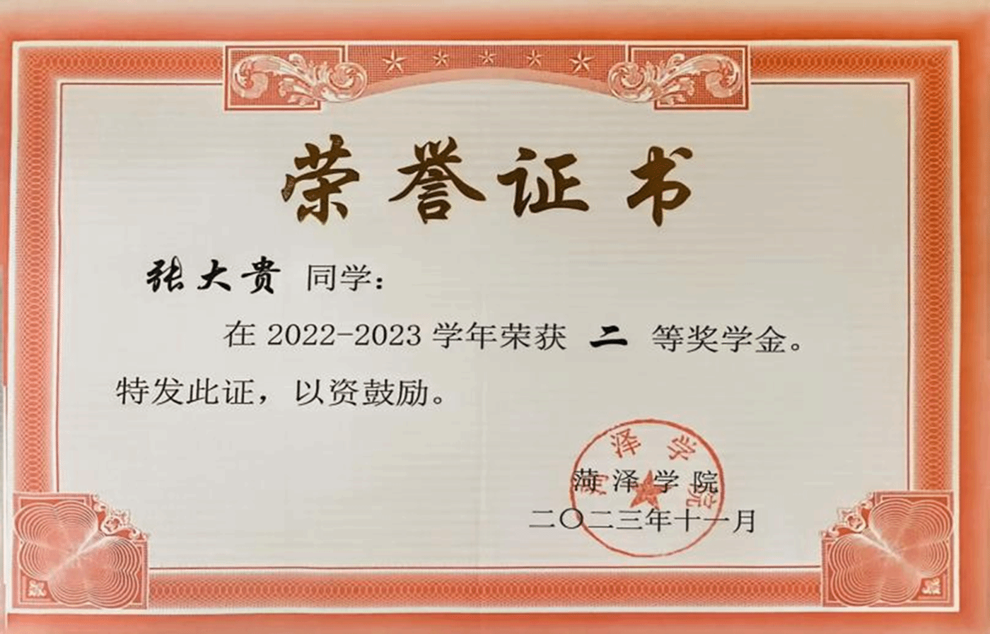笃学不倦,勇攀学业高峰。在学业的征程上,张大贵勤奋刻苦、一丝不苟,始终秉持着对知识的强烈渴望和对学术的敬畏之心。课堂上,他是那个全神贯注听讲、积极回答问题并与老师积极互动的学生;课后,图书馆和自习室成为他的“第二战场”,他沉浸在书本的海洋里,努力钻研每一个知识点,不断拓宽自己的知识面。历经数载拼搏,终在2023-2024学年取得学习成绩班级第一,年级第三的优异成绩。