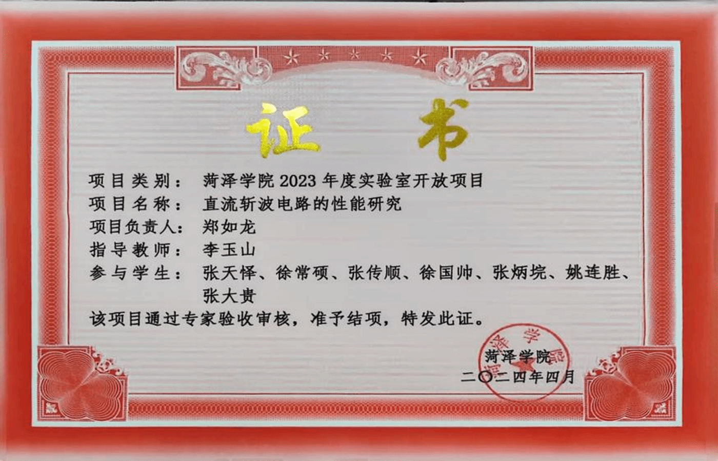 2024年4月,成功申请《直流斩波电路的性能研究》实验开放项目并完成结项。