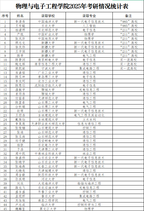 经统计,2025届毕业生考研学生数为76人,46名毕业生成功“上岸”,考研录取率达到60.53%!其中,李清秀、王有毓两名同学考入985院校,顾志龙、杨濠珲、徐庆伟等7名同学被211院校录取,陈景润、鲍允琪等3名同学进入双一流大学深造。从精密严谨的实验室到灯火通明的自习室,从三尺讲台的谆谆教导到考研路上的暖心护航,全院上下同心协力,终迎硕果盈枝。