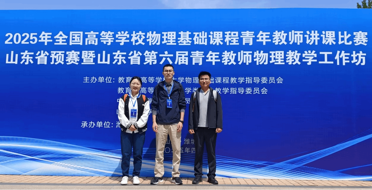 2025年4月26日,2025年全国高等学校物理基础课程青年教师讲课比赛山东省预赛在潍坊学院隆重举行,来自山东大学、聊城大学、山东科技大学、山东农业大学等省内十余所高校的39名青年物理教师参加了本次比赛。经过激烈角逐,beat365官网三位教师表现优异,斩获佳绩。其中,张传彪老师荣获特等奖,张璐老师和房灵猛老师获得二等奖,展现了beat365官网青年教师扎实的教学功底和优秀的教学风采。