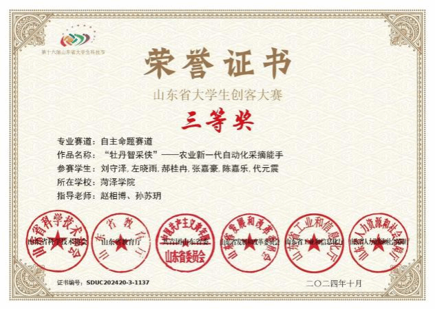 2024年10月,获山东省大学生创客大赛三等奖;