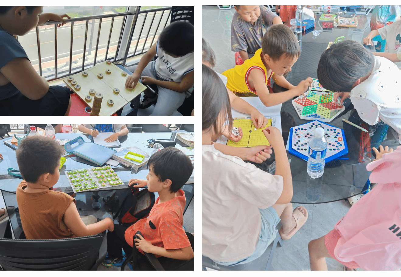 一天接近尾声,对传统文化的热爱依旧炽热。孩子们取出象棋、军棋、五子棋、飞行棋等各式棋子,开启棋艺课。棋盘上,或思索布局、或巧妙对弈,棋子纷飞间,策略思维、协作意识悄然培养,传统文化的多元魅力,在趣味对弈里尽显,为充实一天画上欢乐且富有深意的句点。