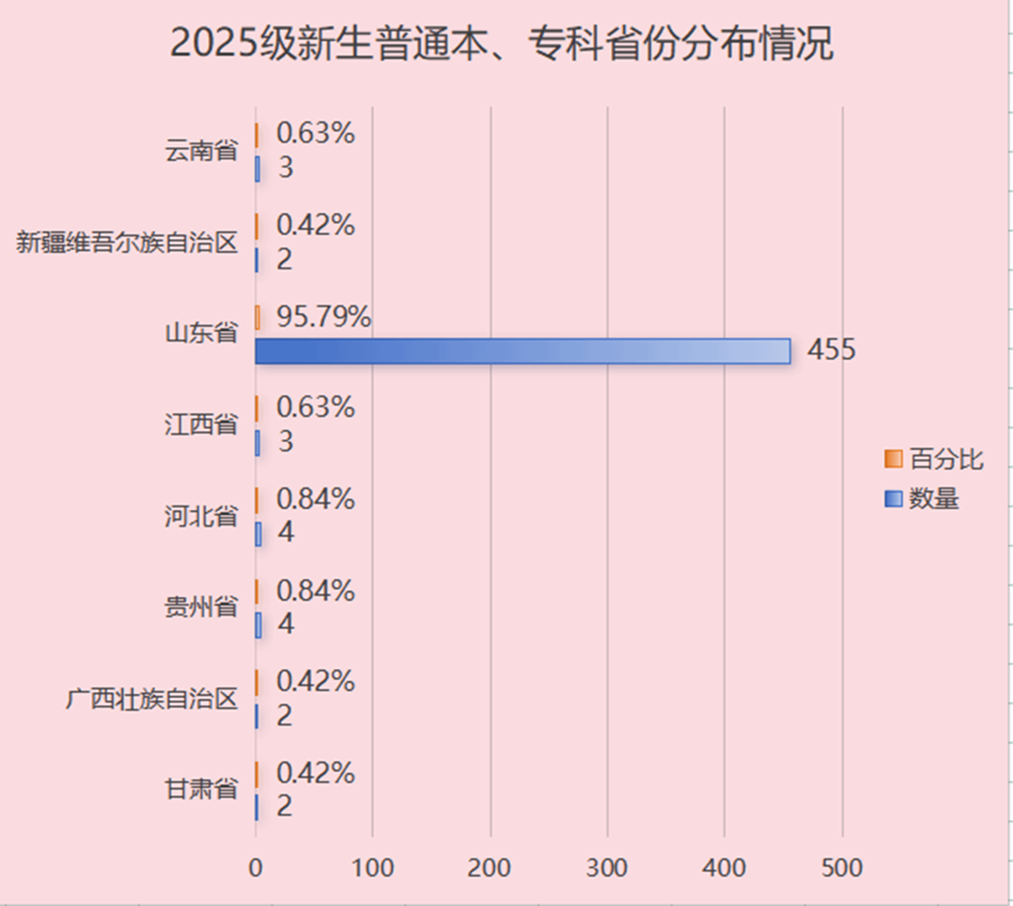 beat365官网2025级普通本、专科新生生源覆盖多个省份,其中山东省生源共计455人,占总人数的95.79%,占据绝对主体;其余来自其他省份的新生占比为4.21%,共同构成了多元的地域结构。