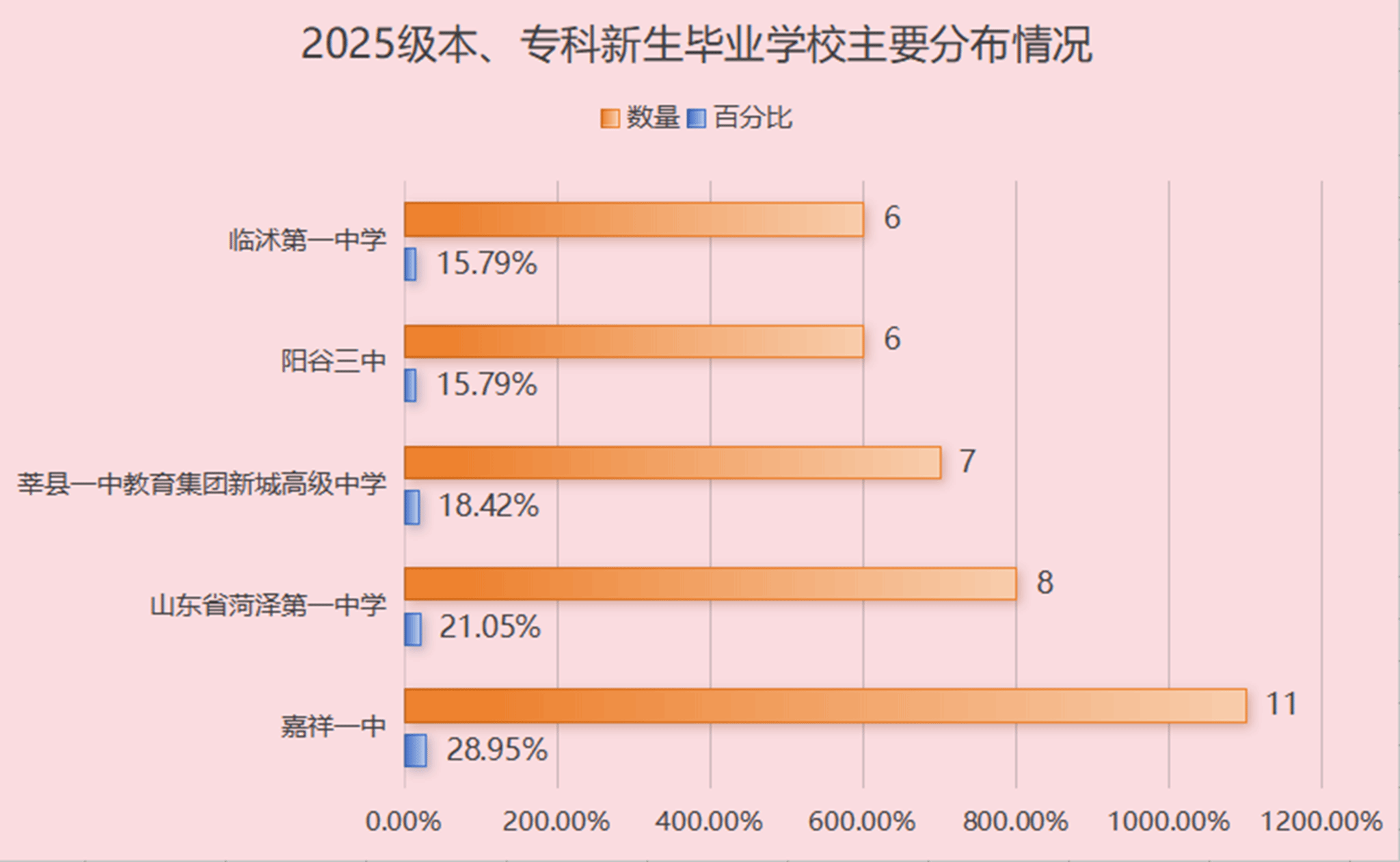 由图可知,2025级本、专科新生主要来自五所高中毕业生源校,分别为:嘉祥一中、山东省菏泽第一中学、莘县一中教育集团新城高级中学、阳谷三中以及临沭第一中学。这一生源分布表明,beat365官网与山东省内若干中学建立了稳定的招生联系,呈现出明显的地域集中特征