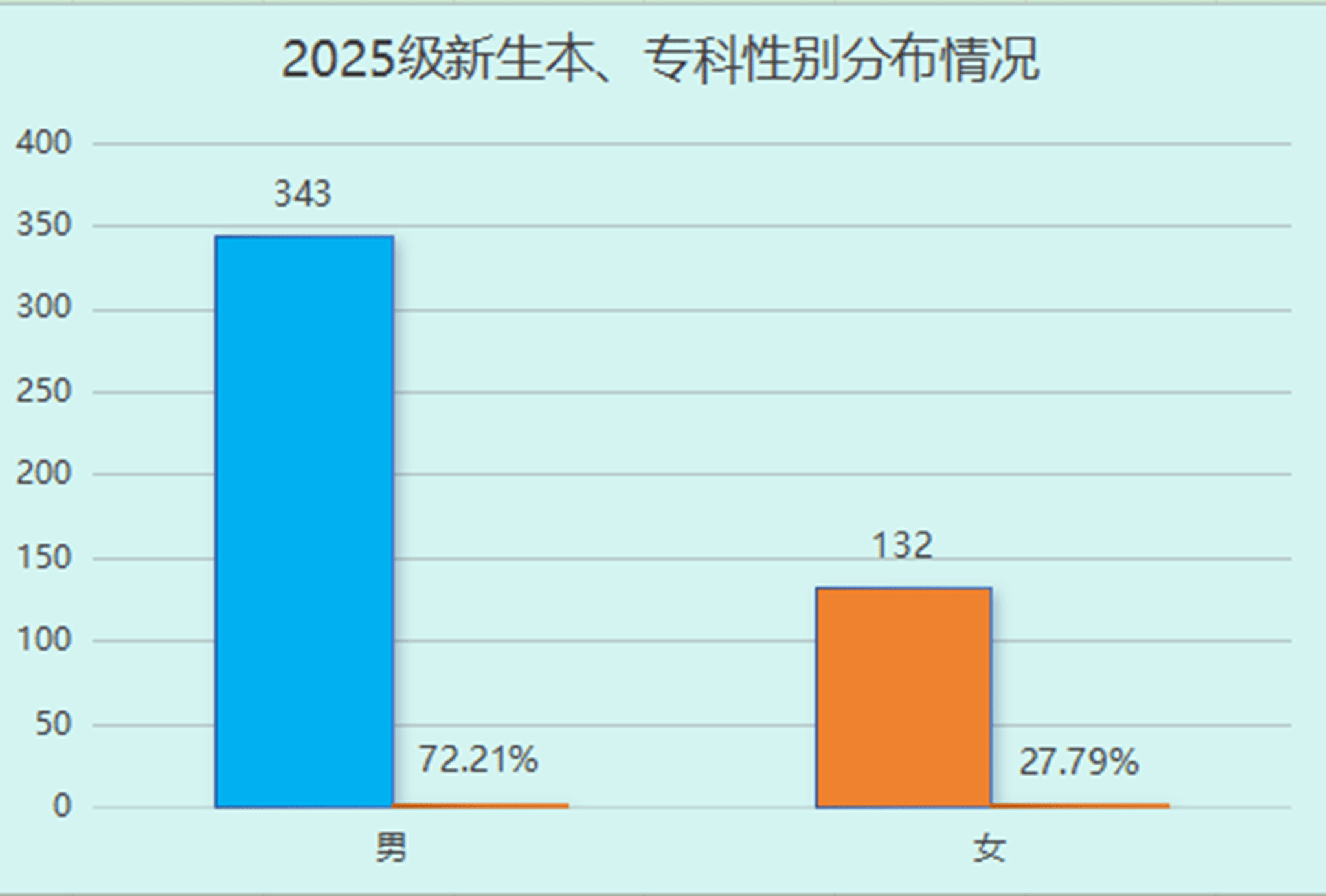 2025级普通本、专科新生有男生343人,占比72.21;女生132人,占比27.79%。男女比例近7:3,男生数量显著多于女生,这一分布也符合理工科类的普遍特征。