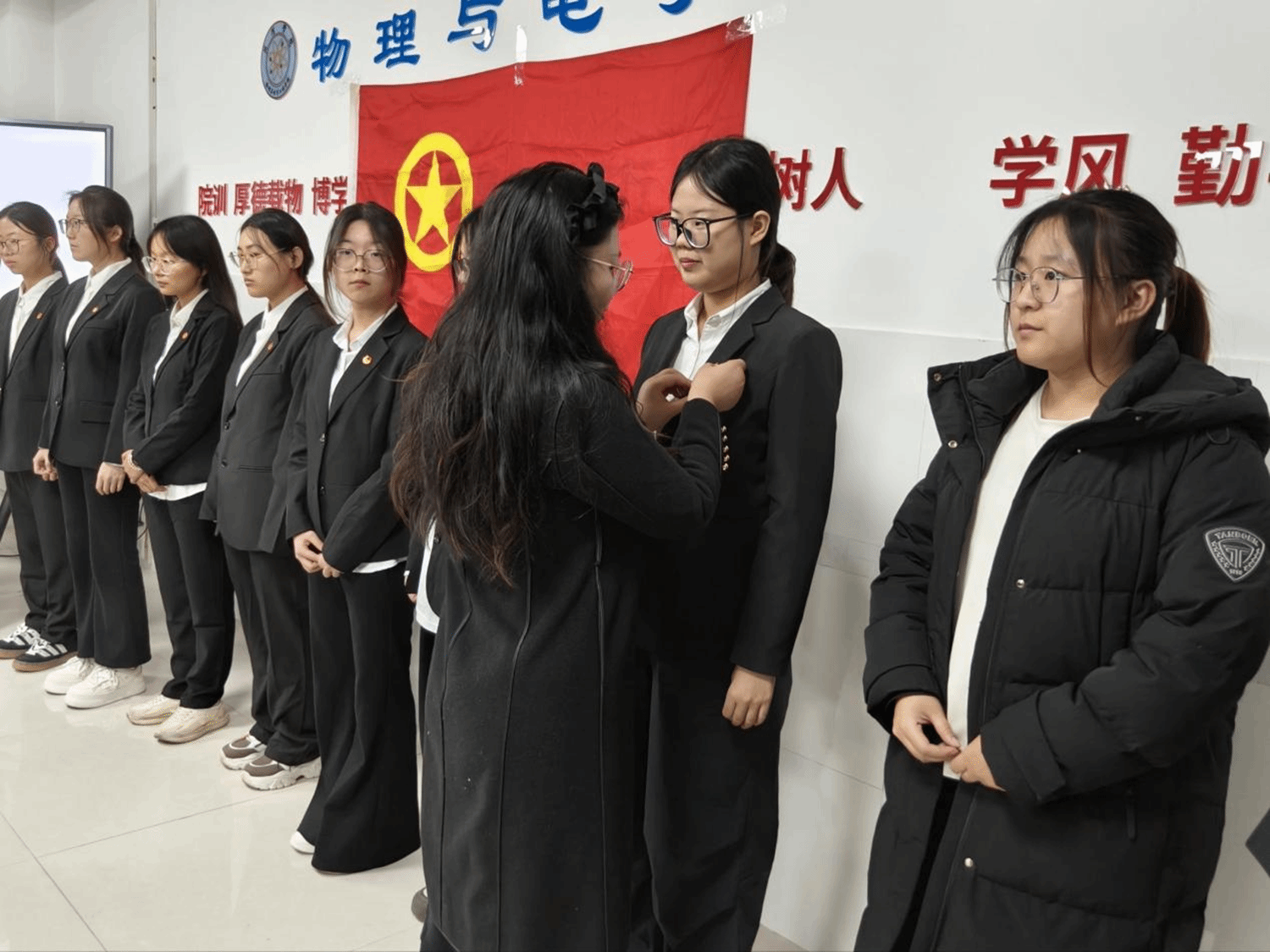 随后,许莉老师为新团员颁发团徽徽章及团员证,勉励全体新团员以入团为新起点,牢记团员身份,践行团员责任,将个人成长融入校园发展与时代进步,做到勤学善思、笃行实干。在优秀团员代表李文昊的带领下,新团员面向团旗庄严宣誓,铿锵的誓言表达出对理想的坚守,对祖国的承诺,对青春使命的担当,展现出为共产主义事业奋斗的决心。