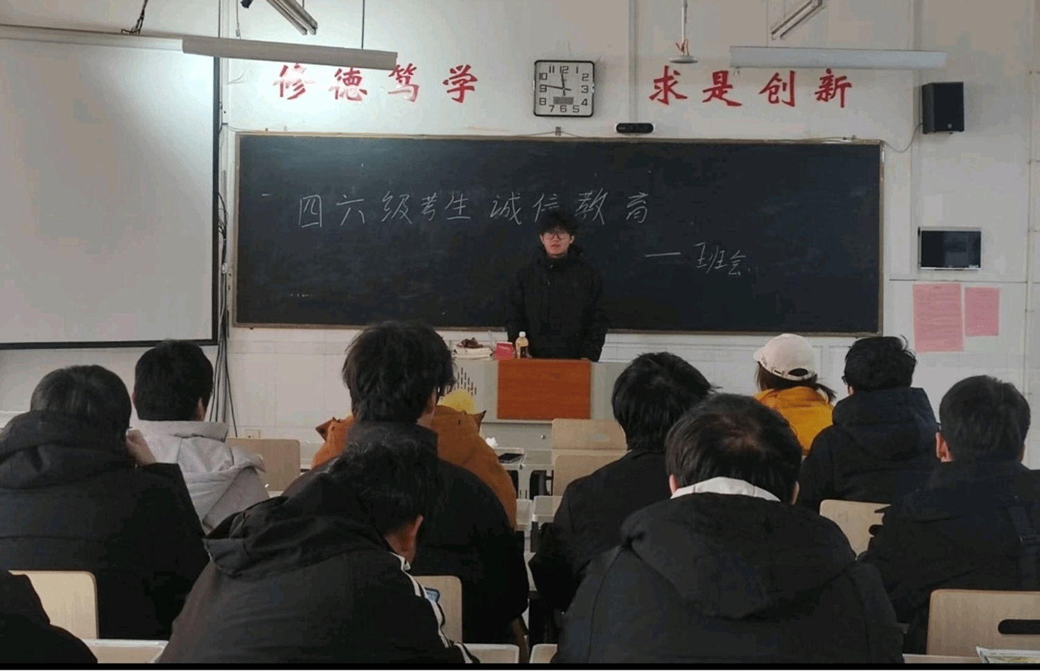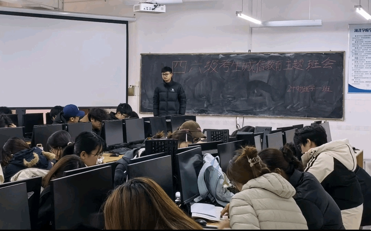 此次班会顺利展开,不仅让诚信应考的理念深入人心,更以深刻的案例剖析与制度解读,为同学们筑牢了思想防线。愿全体同学以饱满昂扬的学习热情深耕备考之路,以笃定坚毅的必胜信念迎战考场,严守纪律底线、秉持诚信本心,凭借扎实学识与良好心态沉着应考,在四六级考试中斩获佳绩,书写属于自己的青春答卷。