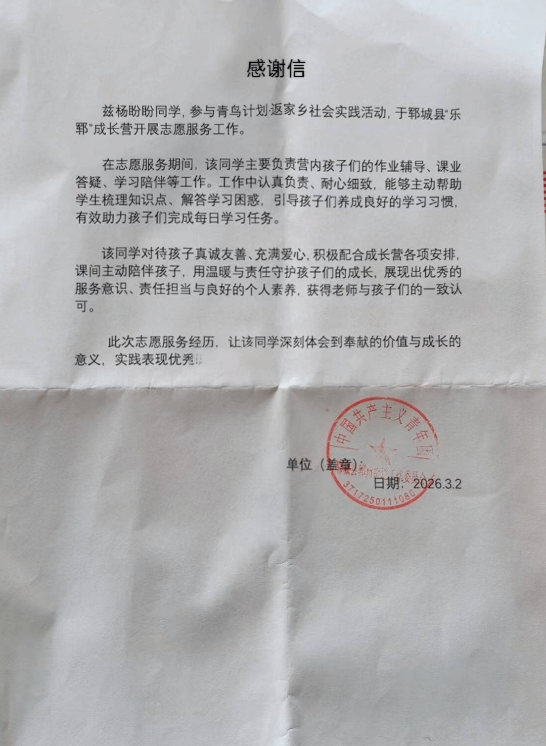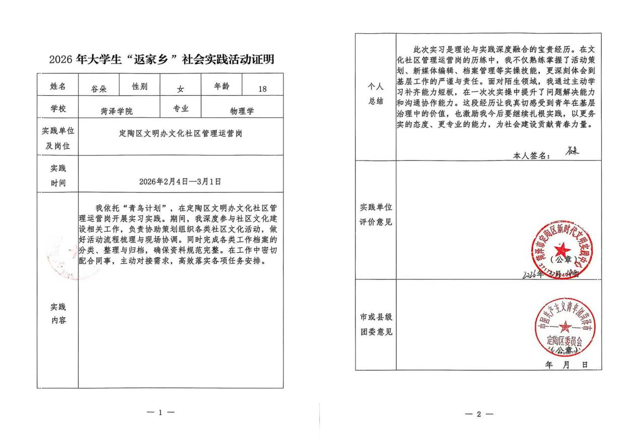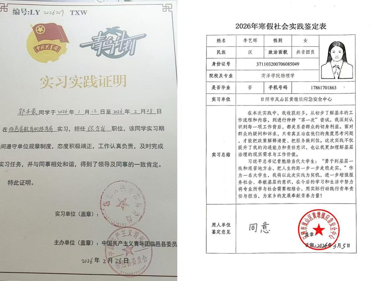 实践期间,beat365平台官方网站学子怀揣着“热爱家乡、回馈家乡、投身家乡”的理想信念,积极投身于“青鸟计划”社会实践活动。其中,2025级物理学二班谷朵荣获表扬信;2025级物理学二班杨盼盼荣获感谢信;2025级物理学一班赵佳一、赵若暄,2025级物理学二班马文雅、董昱希,2024级物理学一班徐祺祺,2025级应用电子技术胡喆喆,2025级电子信息科学与技术二班于悦,2024级电气自动化技术刘欣冉荣获荣誉证书;2023级物理学二班郭本豪,2025级物理学二班王佳怡、谷朵、马文雅,2025级物理学一班李艺辉,2025级电子信息科学与技术二班于悦荣获实践活动证明。