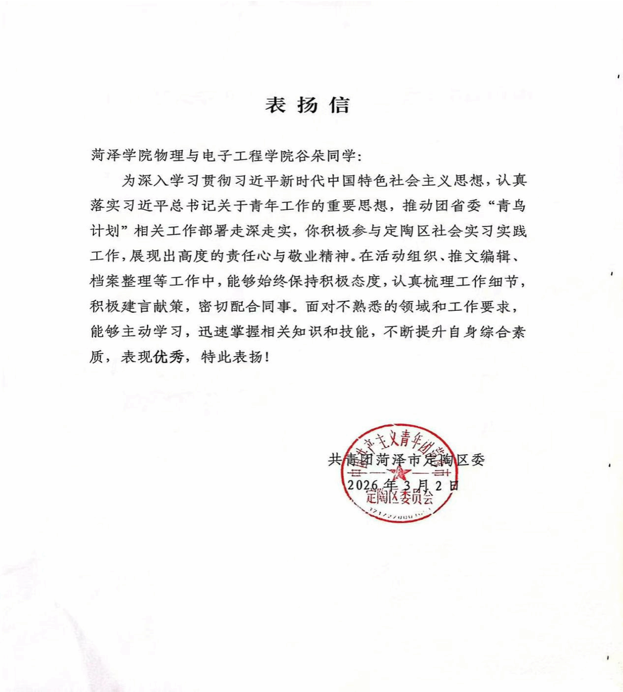 此次表扬不仅是对个人的嘉奖,更是对beat365平台官方网站人才培养模式和“青鸟计划”等实践活动的高度认可。beat365平台官方网站将以此为契机,不断深化社会实践的广度与深度,鼓励更多学子走出校园,走进社会,将所学知识转化为服务家乡、服务社会的实际行动。