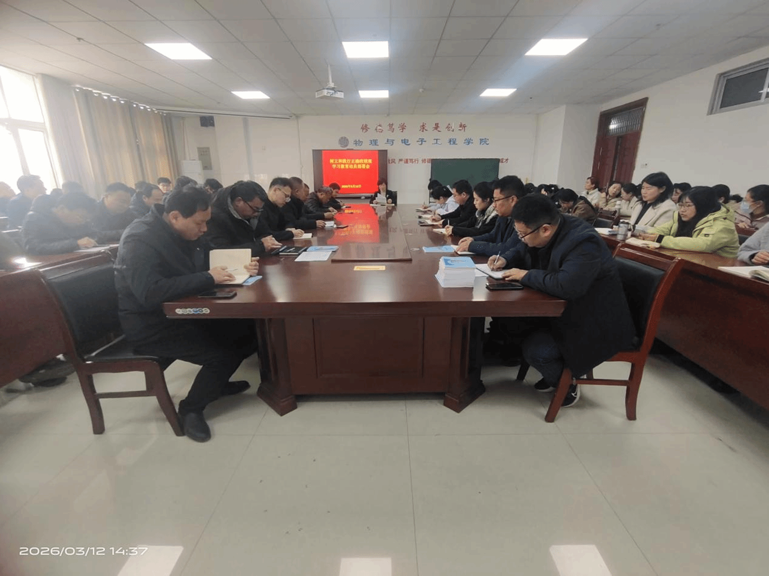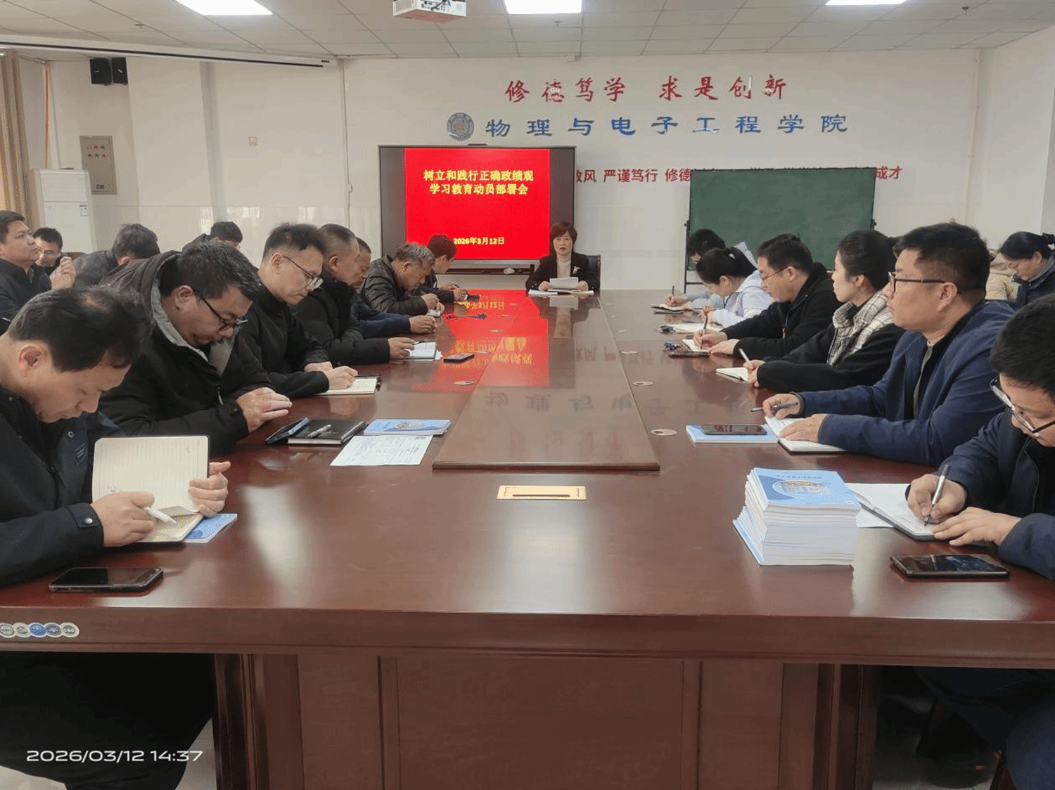 会议伊始,党委书记徐鹤围绕“树立和践行正确政绩观”这一核心主题,传达了上级相关工作部署与要求,深刻阐释了正确政绩观的科学内涵与实践要求。会议强调,全体师生要深刻认识到,正确政绩观是推动学院高质量发展的根本遵循,要始终坚持以师生为中心的发展思想,把工作成效体现在提升育人质量、优化学科建设、服务地方发展等具体实践中,坚决杜绝形式主义、官僚主义,以务实作风推动各项工作落地见效。
