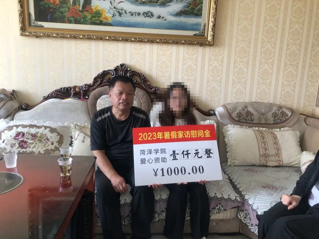 在家访过程中,家访小组将慰问品和1000元慰问金送到学生家长手中。