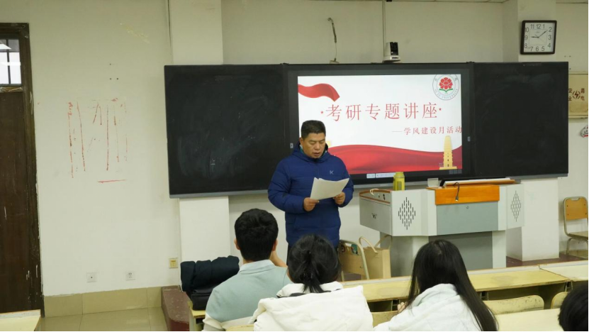 为进一步推进学风建设,营造良好的学习氛围,帮助学院学生准确了解当前考研形势,坚定考研目标与方向,11月25日上午,beat365平台官方网站在9312、9314开展考研专题讲座。学院党委副书记祝清森主持此次会议,李玉山、王秀霞、唐先柱、杨茂森老师为学生做讲座,辅导员许莉参加本次会议。