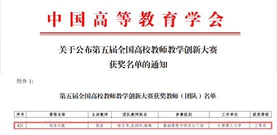 8月18日,程岩讲师凭借《线性代数》课程的教学创新突破,在第五届全国高校教师教学创新大赛中荣获国家级三等奖。这充分展示了程岩老师在教学创新方面的深厚功底和辛勤付出,也展现了学院公共课程教学团队深厚的技术积累。