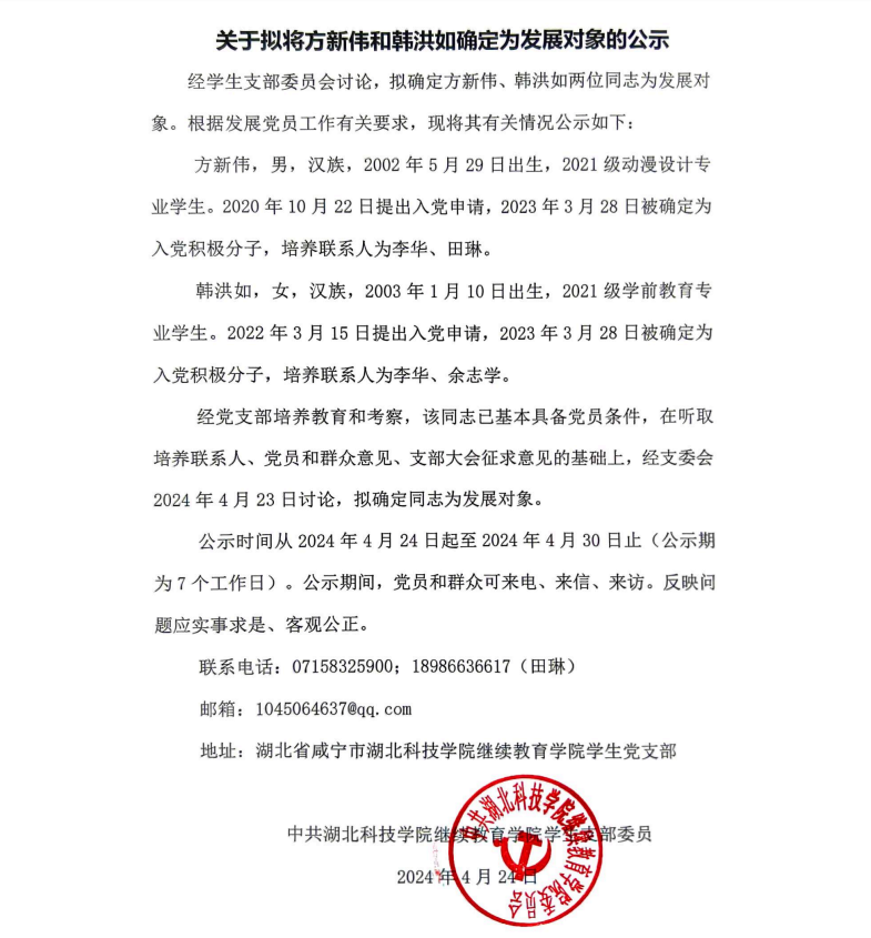 Williamhill中文官网网站学生支部关于拟将方新伟和韩洪如确定为发展对象的公示