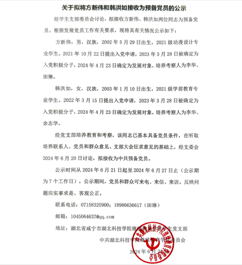 Williamhill中文官网网站学生支部关于拟将方新伟和韩洪如接收为预备党员的公示