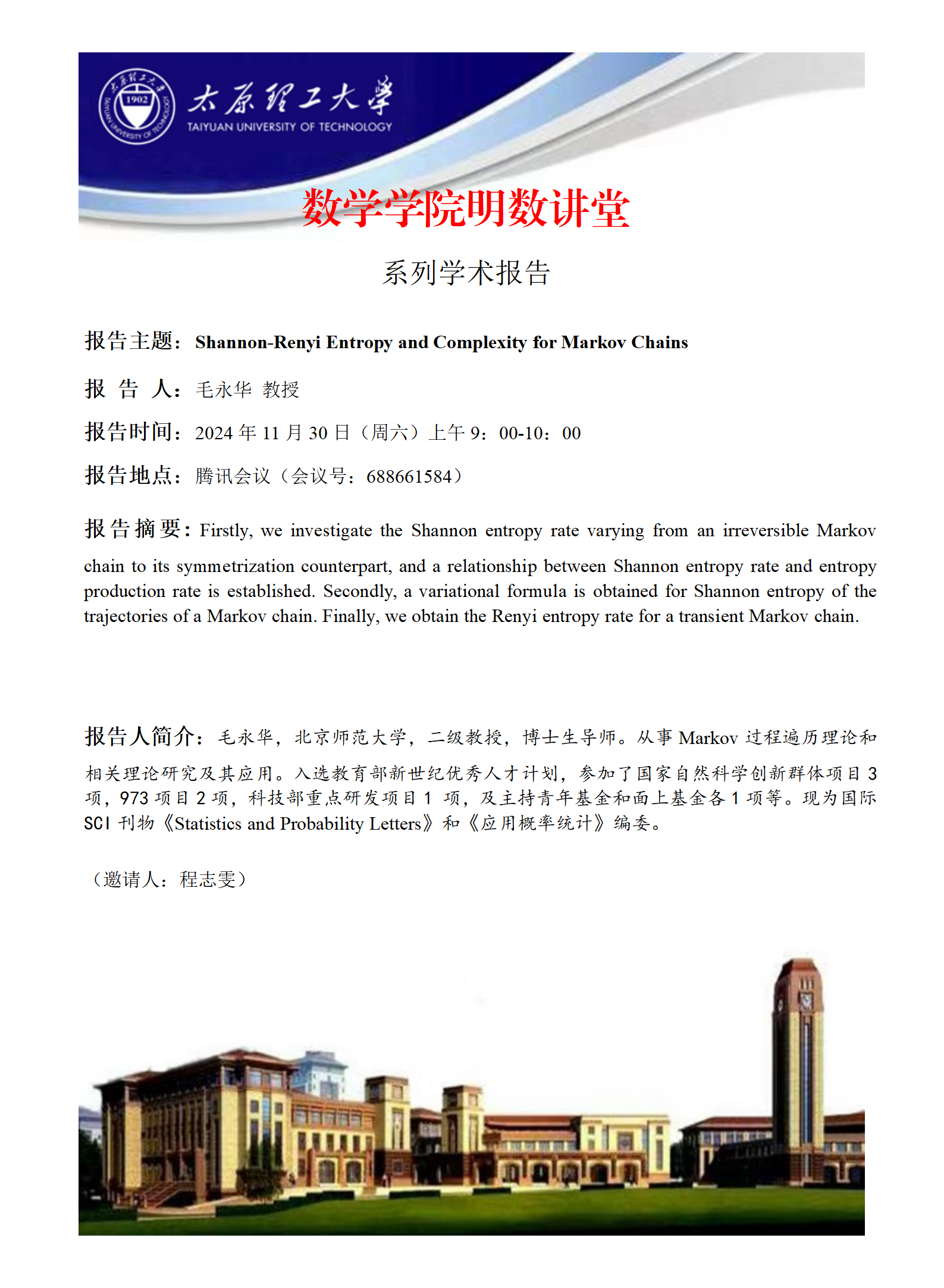 报告主题:Shannon-Renyi Entropy and Complexity for Markov Chains